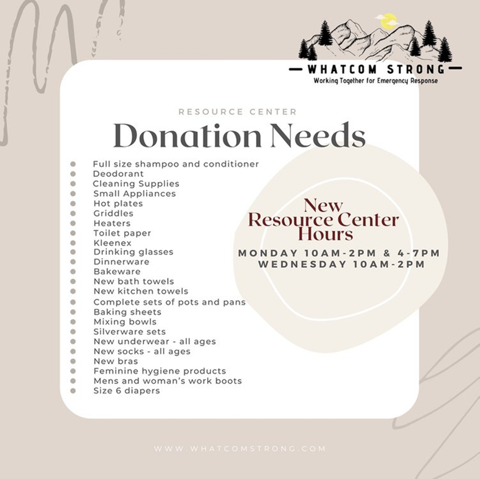 These items are needed by people who experienced flood or landslide damage in the Whatcom County flooding. You can drop these off at the Resource Center at 1700 Kok Road. Please enter at Gate 5 to access the center. Even easier, there is a Wish List you can access on Amazon.com.