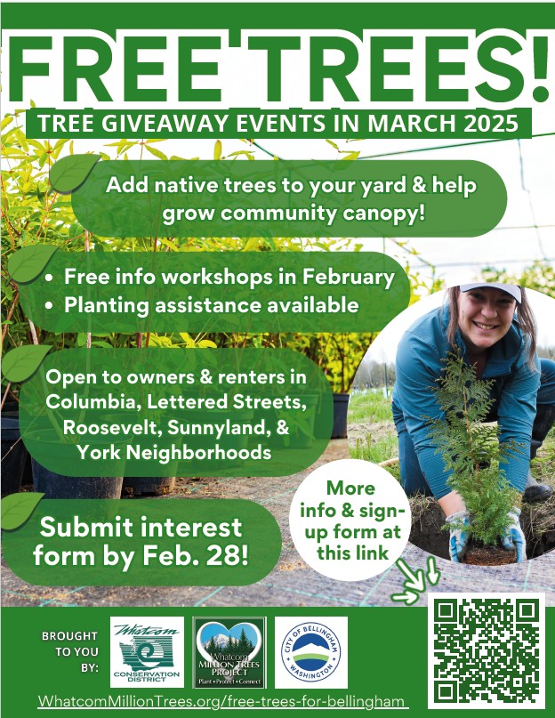 Whatcom Conservation District and Whatcom Million Trees Project, in partnership with the City of Bellingham, are giving away free yard trees to residents of five neighborhoods: Columbia, Roosevelt, Lettered Streets, Sunnyland, York. Visit http://whatcommilliontrees.org/free-trees-for-bellingham/ to register or for more information. You can click on the image below to download a photo.