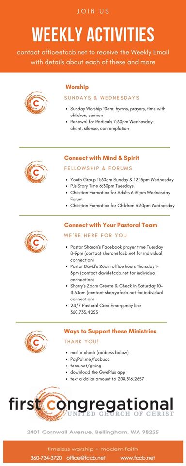 At the time of this writing, we in Washington state have been sheltering in place since March 23, 2020. As the state begins to phase in reopening, we are watching our county's, Whatcom County, status. We are till in Phase One, working toward the benchmarks that will move us into the next phase. Though we are taking care of each other by staying at home, we are still reaching out virtually to each other and the community. We have a number of weekly activities open to all. Below is a list of what we've got going on. Most events take place on Facebook Live or Zoom. If you have questions about how to participate, email office@fccb.net.