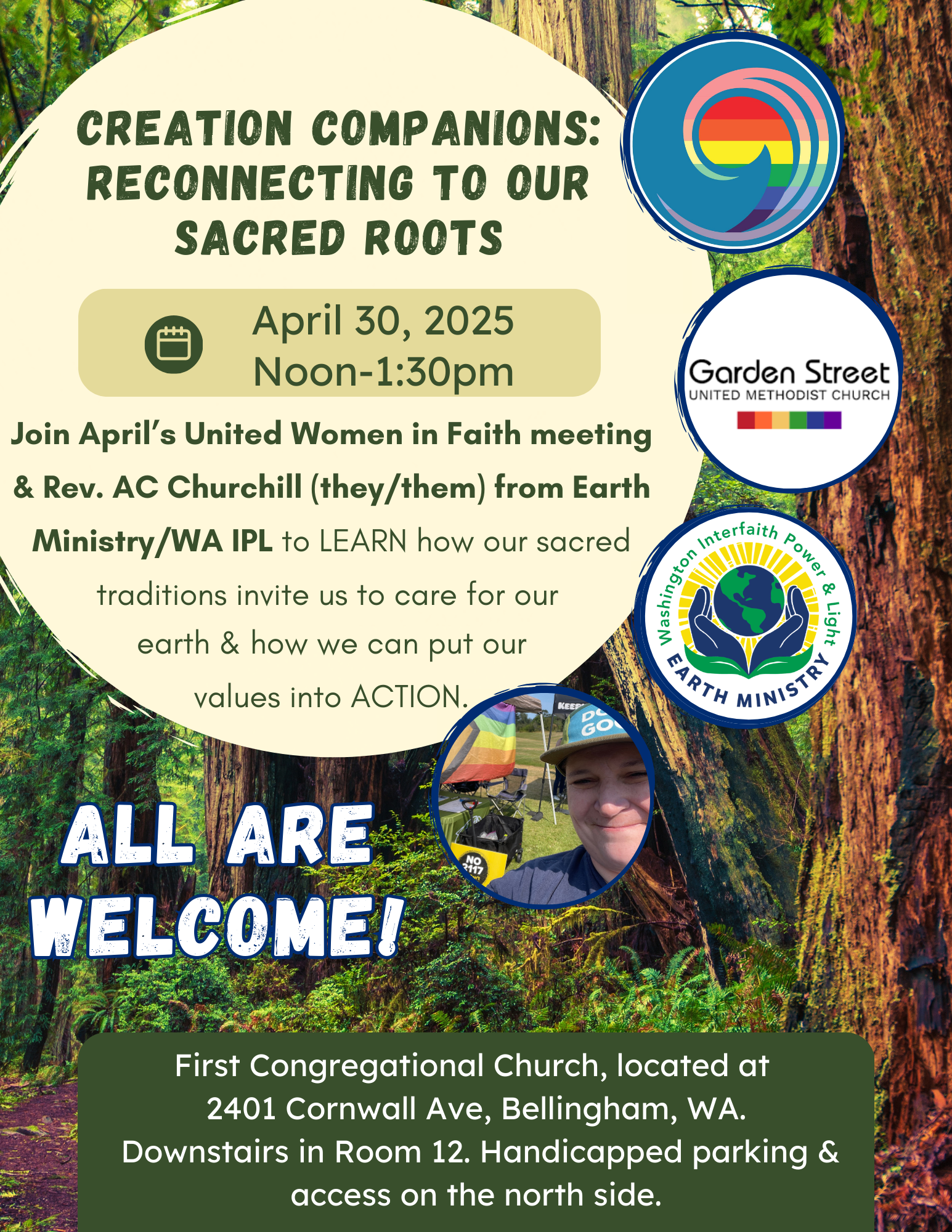 Garden Street United Methodist Church Women of Faith extend an invitation to their April meeting for Creation Companions: Reconnecting to Our Sacred Roots. Rev. AC Churchill from Earth Ministry/WA IPL will speak. They will meet April 30 from 12:00 noon-1:30 pm in Rooms 12/14.