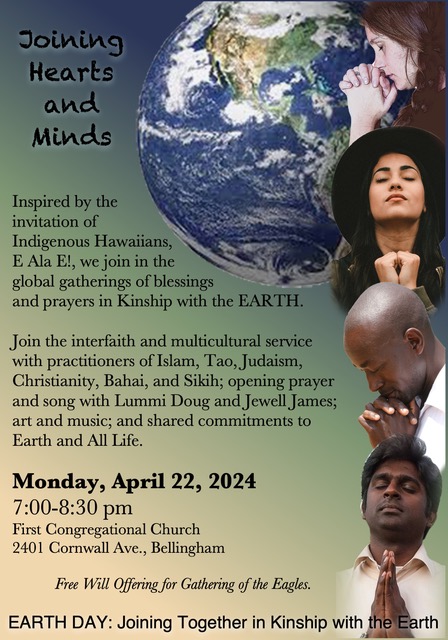 The event will include participation by Doug James, Jewel James and Freddie Lane from Lummi, an address by Rev. Andrea Asebodo of the Church for Spiritual Living, a video by Spring Cheng, entitled “Children of the Earth,” and an art presentation by Beth Anne Margolis. There will be hymns, songs, and prayers. There will be a free will offering.