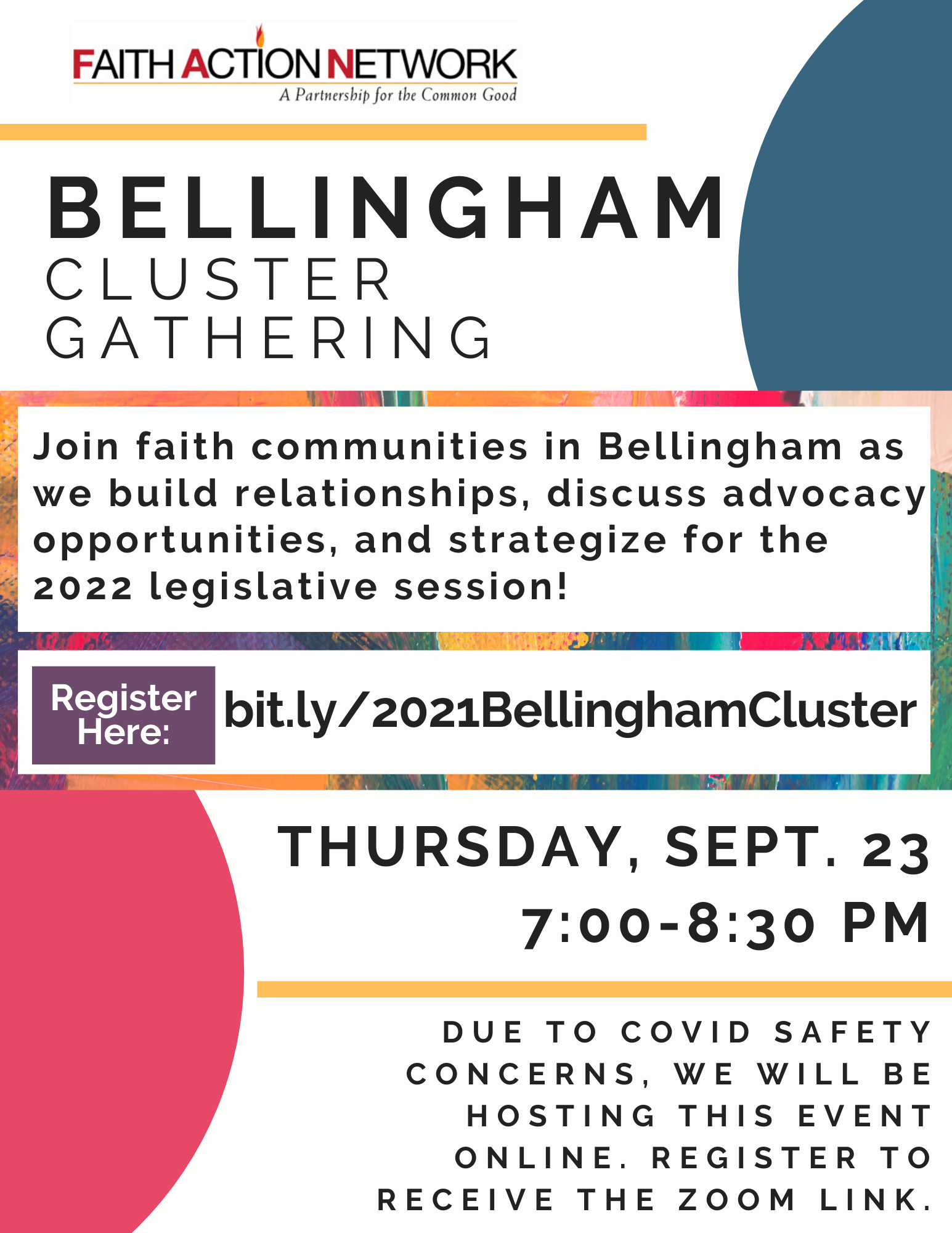 First Congregational Church of Bellingham is a proud member congregation of the Faith Action Network. FAN is a state-wide, multi-faith coalition of congregations engaged in making a more just and sustainable state! Much of their work is with the Washington state legislation. FAN is hosting a Whatcom County Cluster Gathering on Thursday, September 23, 7:00-8:30 pm. The event will be hosted on Zoom. You can learn more and register at: https://fanwa.ourpowerbase.net/civicrm/event/info?id=206&reset=1. This is a great opportunity to hear what FAN worked on last legislative session (including some fantastic victories!), hear about what’s coming next session, and learn more about getting involved!