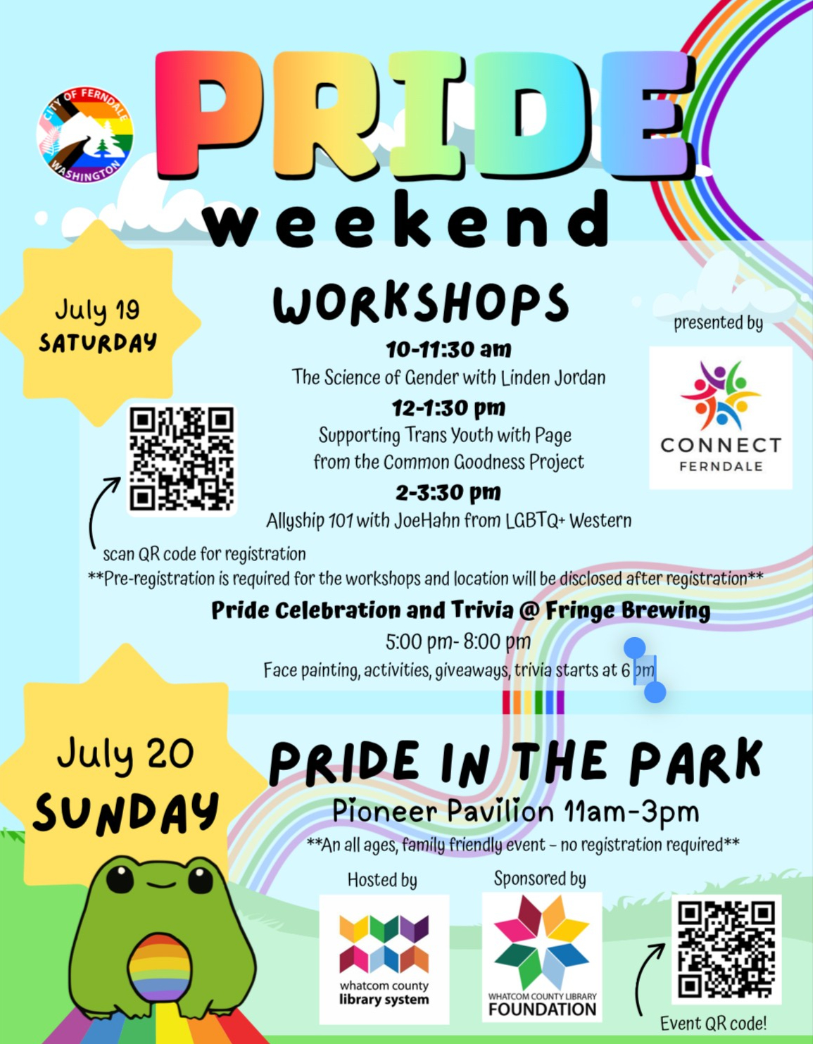 Coming up on July 19 & 20 Connect Ferndale, is cohosting Ferndale's very first annual Pride Weekend. And we would like to extend an invitation to all of you! On Saturday, we'll be hosting a series of workshops, and then in the evening a trivia night at Fringe Brewing. Sunday, the Whatcom County Library System is hosting Pride in the Park at Pioneer Pavilion from 11:00 am-3:00 pm. All are welcome, and we hope to see you there! Click on the image below to download a poster to share!