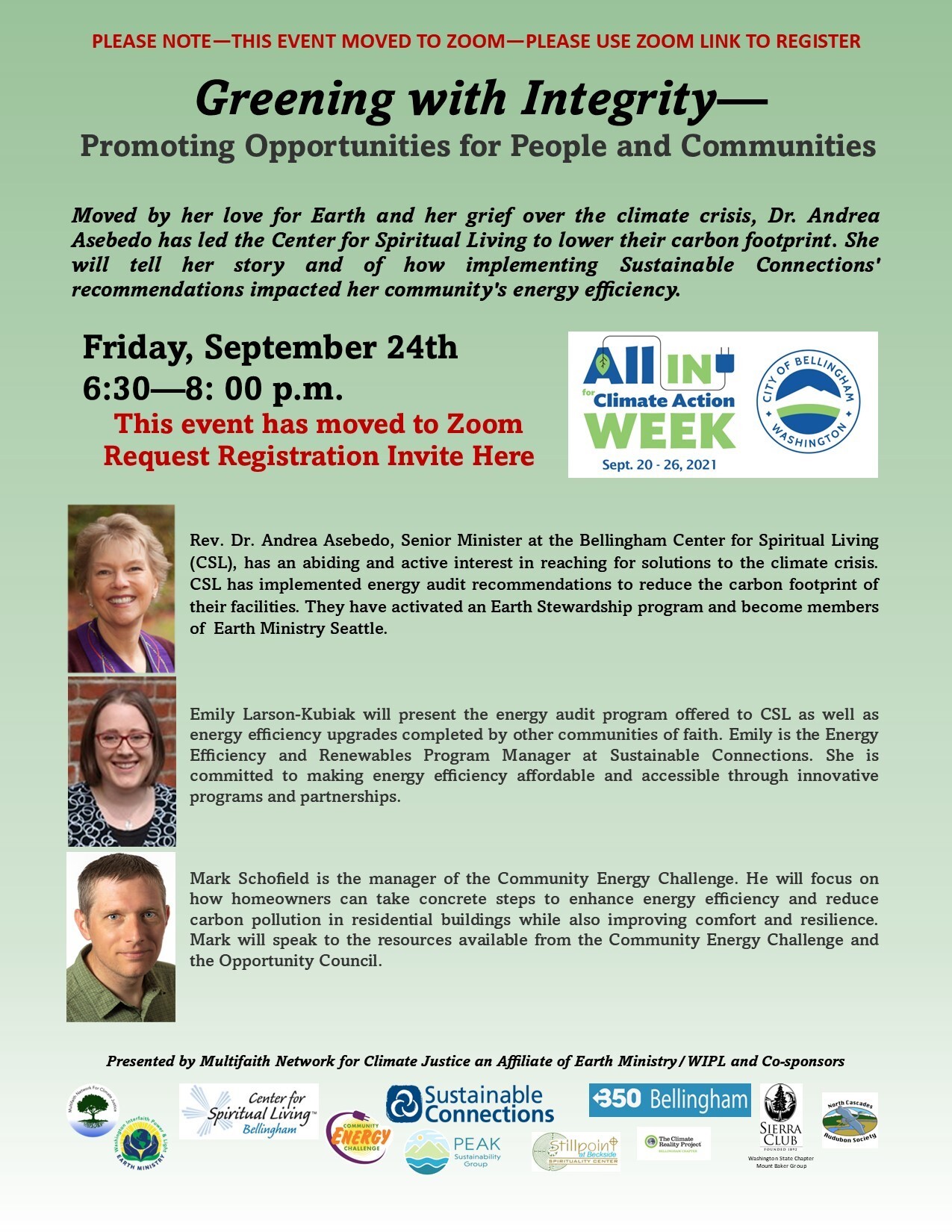 We’re in the midst of Bellingham’s Climate Action Week, and on Friday at 6:30-8:00 pm Multifaith Network for Climate Justice (we’re a member congregation of MNCJ) will present a workshop on "Greening with Integrity.” Our own Mark Schofield is one of the speakers. Registration for this zoom event is necessary—begin registration here: https://us02web.zoom.us/meeting/register/tZItduCoqD4tEtP3_xPsm-viV2APCOj8W5s4 (you will receive an email in response). Follow this link or click on the image below for more details: https://cob.org/event/greening-with-integrity-2021.