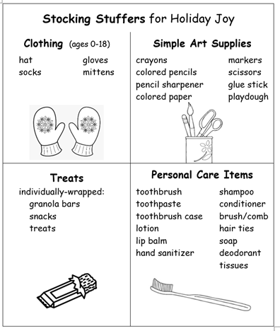 Provide stocking stuffers. Deliver to First Congregational by December 7. See the image below the chart for suggestions.
