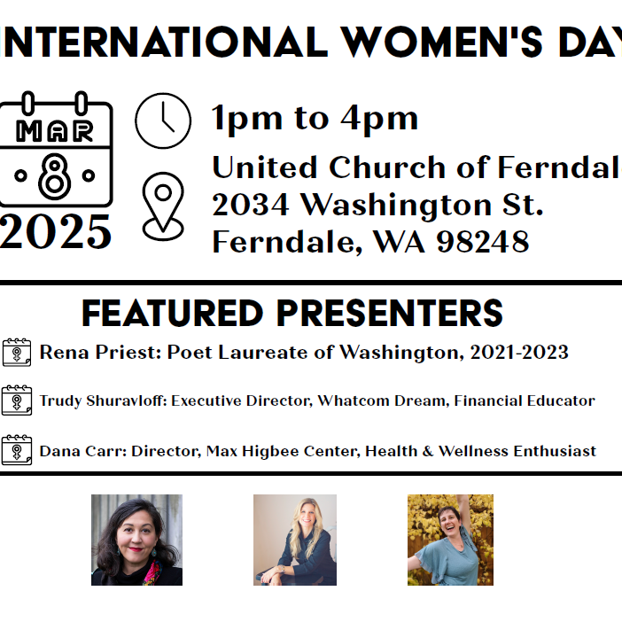 Rena Priest, the Poet Laureate of Washington 2021 -2023, and a member of the Lummi Nation, will be one of three speakers at the International Women’s Day celebration on March 8th in Ferndale. Festivities will be held from 1:00-4:00 pm at the United Church of Ferndale, 2034 Washington Street, the church next to the fire station. Besides Rena Priest, speakers will be Trudy Shuravloff, financial educator and ED of Whatcom Dream, and Dana Carr, Director of the Max Higbee Center, and a health & wellness enthusiast.