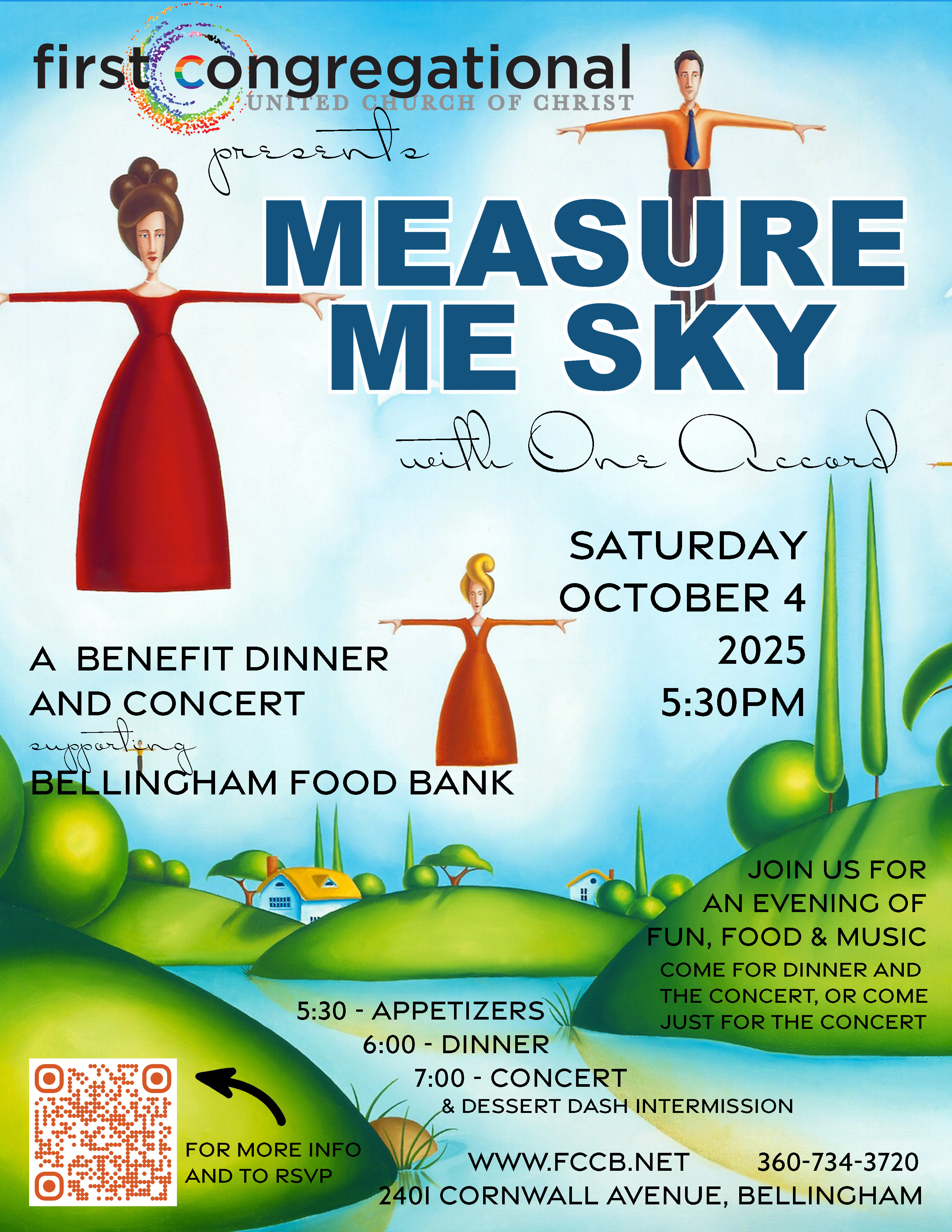 Join us Saturday, October 4 at 5:30 pm for an evening of fun, food, and music! You’re invited to a dinner and concert benefiting the Bellingham Food Bank. Measure Me Sky is a special dinner, along with a concert by One Accord. Donation amounts are suggestions. Pay what you can. The suggested donation for both dinner and concert is $50 per person. The suggested donation for the concert only is $15. This year, there is also the option of reserving a VIP table seating seven for a suggested donation of $400. Please RSVP by filling out this form: https://fccb.breezechms.com/form/bcd7fe98. If you plan to attend the dinner, you must preregister. Registration is not required for those attending only the concert.