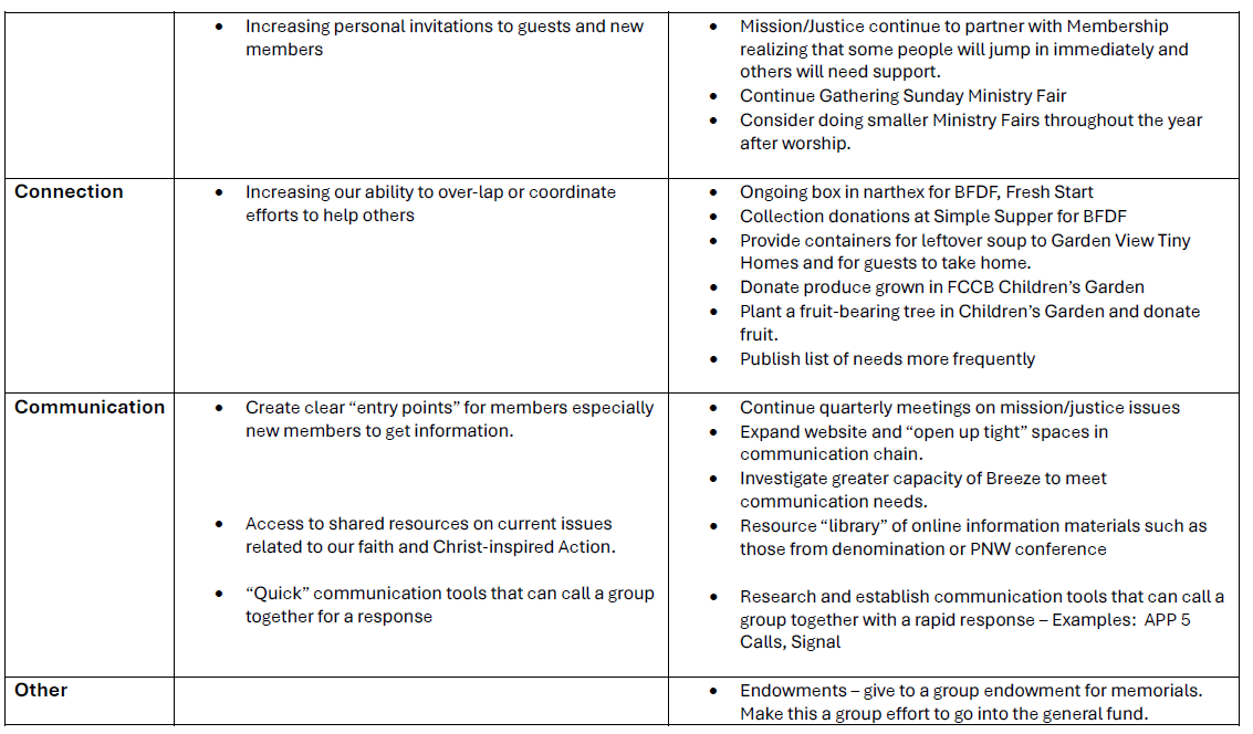 Thirty people met last Sunday in round table discussions to consider what we are already are doing in regards to sharing our funds and building, providing hands-on support in the community and standing up for justice and what are dreams are going forward. Ideas across the round tables addressed congregational education opportunities, how to be invitational/relational in the congregation and across the community, how to build connection between groups within the church, and how to support communication concerns. One of the biggest suggestions was to continue to calendar Round Tables periodically. A summary of the needs and ideas is below. You can download a copy here.