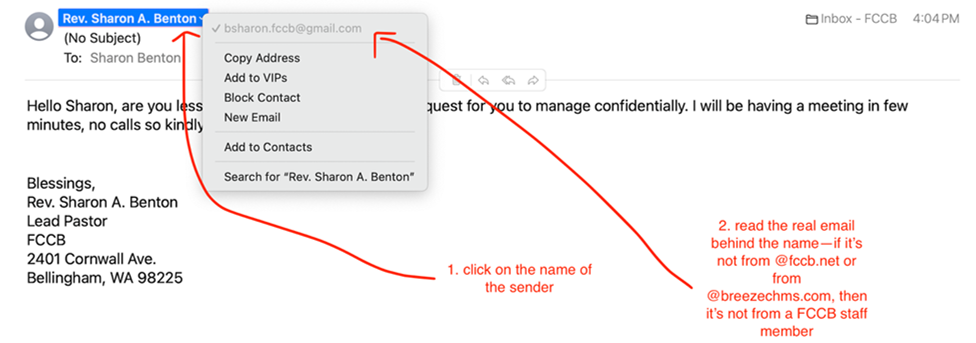 Here is one way to recognize a scam, even when your pastor’s name and photo are attached to the email.