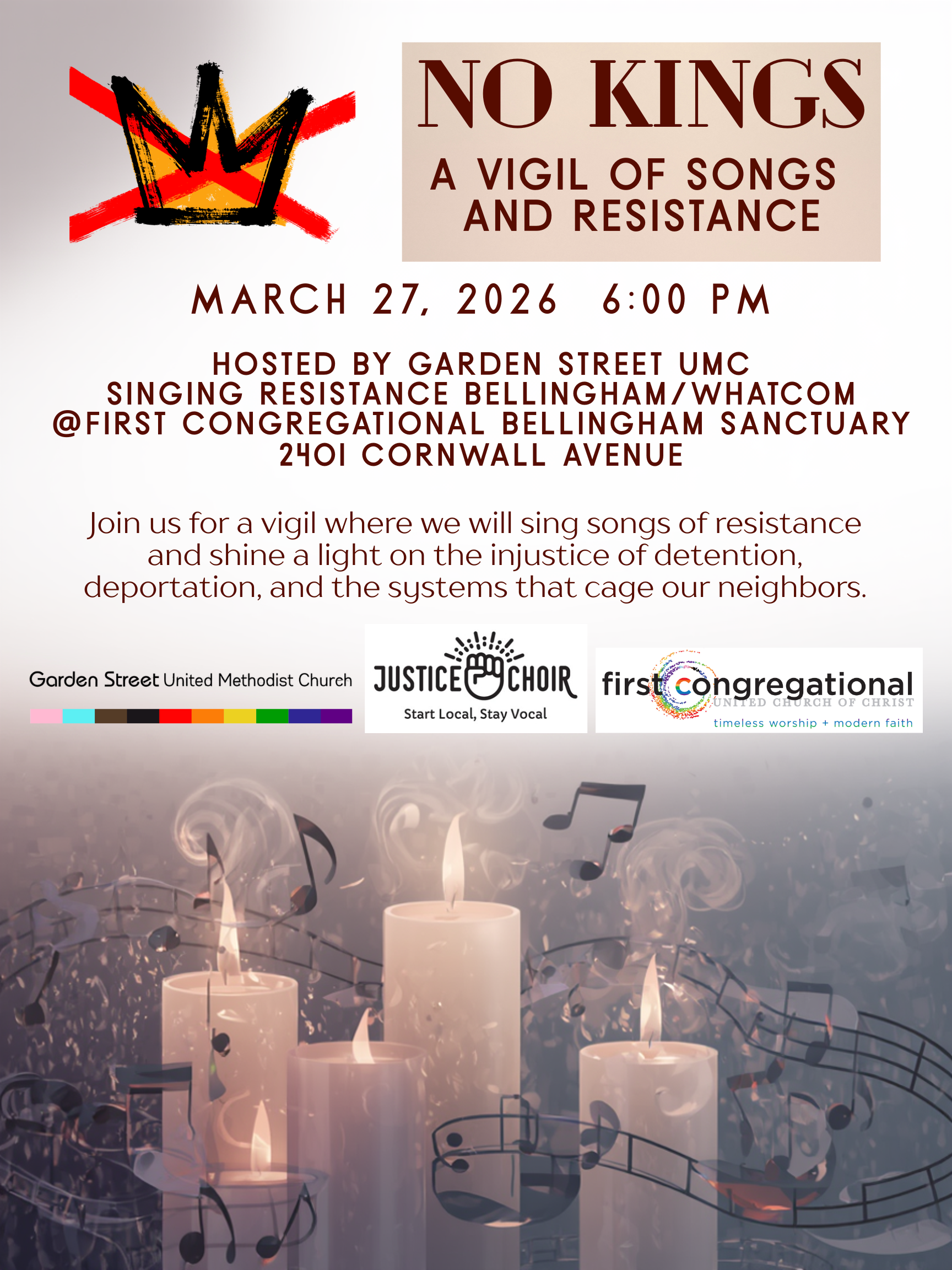 You are invited to an evening to sing songs of resistance, while we shine a light on the injustice of detention, deportation, and the systems that cage our neighbors. This event is Friday, March 27, from 6:00-8:00 pm, the evening before the No Kings Rally. This date is also just days before the anniversary of the April 2 Mount Baker Roofing ICE raid.
