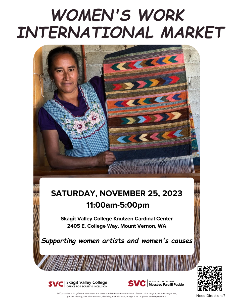 Saturday, November 25, 2023 is the Women's Work International Market's 10th Anniversary! Come shop and celebrate at Skagit Valley College's Knutzen Cardinal Cente, 2405 E. College Way, Mt. Vernon. Women's Work International Market is an informal network of women in Washington who share a commitment to encourage women's economic development and preserve women's traditional arts by creating a platform for artisans to sell their work at a fair price to support themselves and their families and communities. Learn more on their Facebook page: https://www.facebook.com/womensworkwashington/