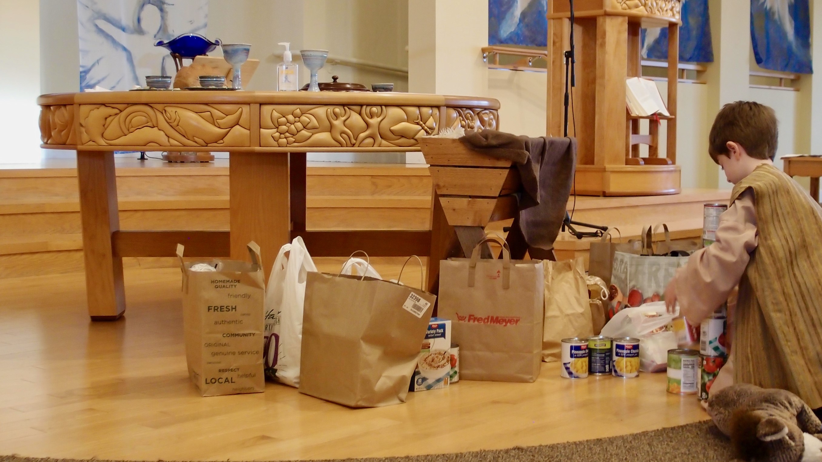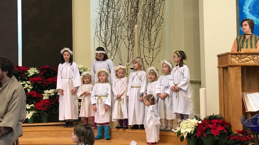 We love children in worship—their noises and wiggles are welcome, too. There are pillows in the front where they can see the instruments and participate fully, or the coloring, book, and play area is available in the corner near the windows. Their movements back and forth are a joy for all of us.